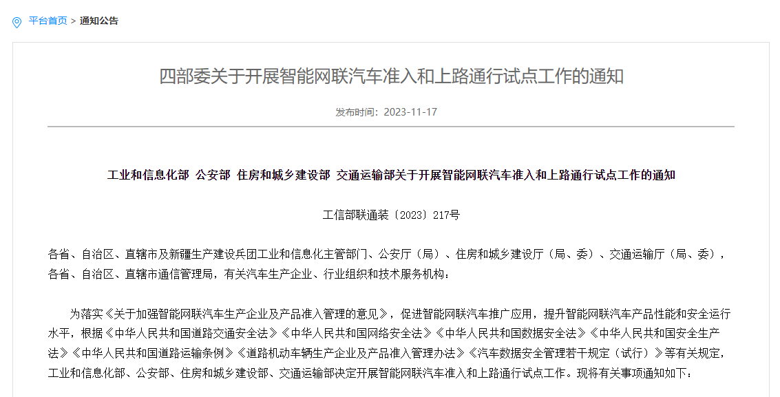 2023年11月18日,工信部發(fā)布《關于開展智能網聯(lián)汽車準入和上路通行試點工作的通知》,明確參與試點的智能網聯(lián)汽車搭載的自動駕駛功能是指國家標準《汽車駕駛自動化分級》(GB/T 40429-2021)定義的3級駕駛自動化(有條件自動駕駛)和4級駕駛自動化(高度自動駕駛)功能。