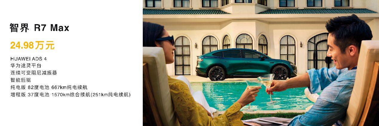 新款智界R7 Max+版售價26.98萬元,較Max版高出2萬元,主要升級在,純電版換裝100度電池,續航802km。而增程版本電池擴容至53.4度,純電續航達360Km,進一步緩解里程焦慮。此外,Max+版副駕零重力座椅極大提升了乘坐舒適性與豪華體驗。若您經常長途出行,或副駕常陪伴家人,Max+版的續航提升與舒適享受,顯然而見尤為超值。