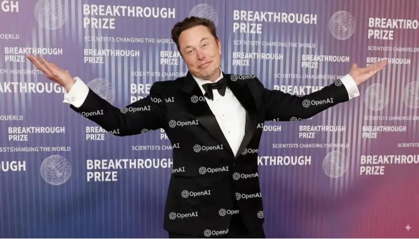 Prompt:將多張OpenAI商標圖印在Elon Musk的黑色西服上。