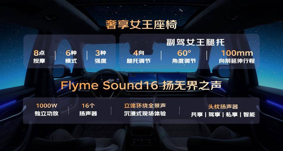 配置方面,新車提供前排座椅加熱 / 通風(fēng) / 按摩、方向盤(pán)加熱、以及后排座椅 30-40 度電動(dòng)調(diào)節(jié);車內(nèi)環(huán)境氛圍燈以及 Flyme Sound 無(wú)界之聲 16 揚(yáng)音響系統(tǒng)等均為全系標(biāo)配。煥新升級(jí)的“奢享女王副駕”,擁有8點(diǎn)座椅按摩,6種模式,3種強(qiáng)度,以及新增4項(xiàng)腿托功能,只需輕觸調(diào)節(jié),腿托即可向前延伸達(dá)100毫米,并支持高達(dá)60度的多角度自由調(diào)節(jié)。