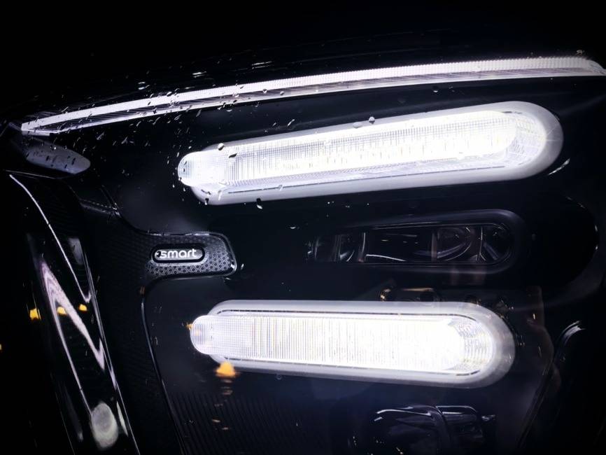 車頭矩形輪廓配合賽博光影貫穿式LED大燈,營造出沉穩而不失科技感的視覺效果,結合“膠囊”設計元素,一眼便知這是smart。