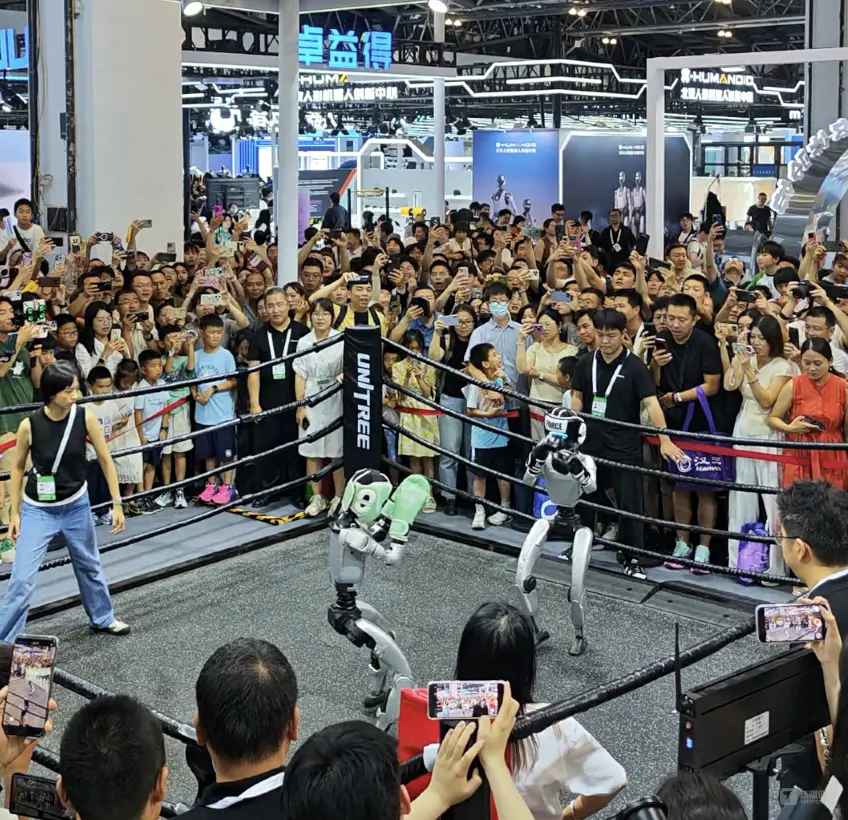 其中,宇樹科技G1格斗機器人也將格斗場搬到了上海世博展覽館。宇樹科技展臺的人形機器人擂臺賽成為全場焦點,兩款機器人拳拳到“鐵”,靈活閃避、迅猛出拳,引得圍觀家長和孩子們驚呼連連,手機鏡頭幾乎擠不進擂臺。