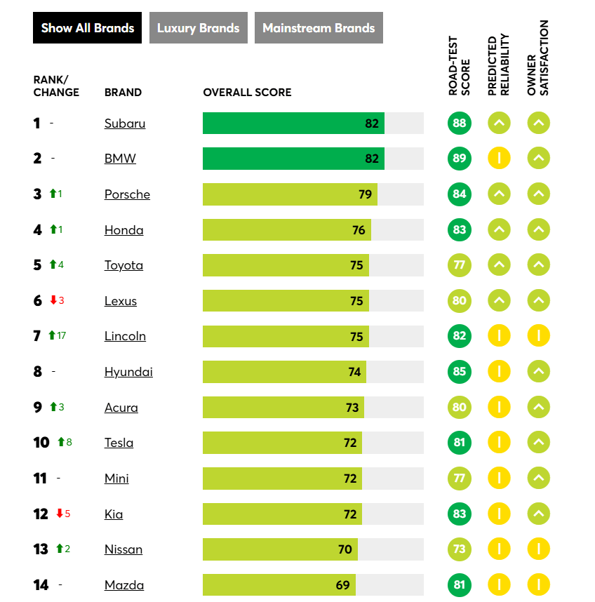 值得注意的是,《消費者報告》的這份排名,只有測試了某品牌至少兩款在售車型的情況下,才會將其納入品牌排名。因此,榜單中沒有出現菲亞特、英菲尼迪、捷豹、Lucid、瑪莎拉蒂、Polestar或Ram的評分。
