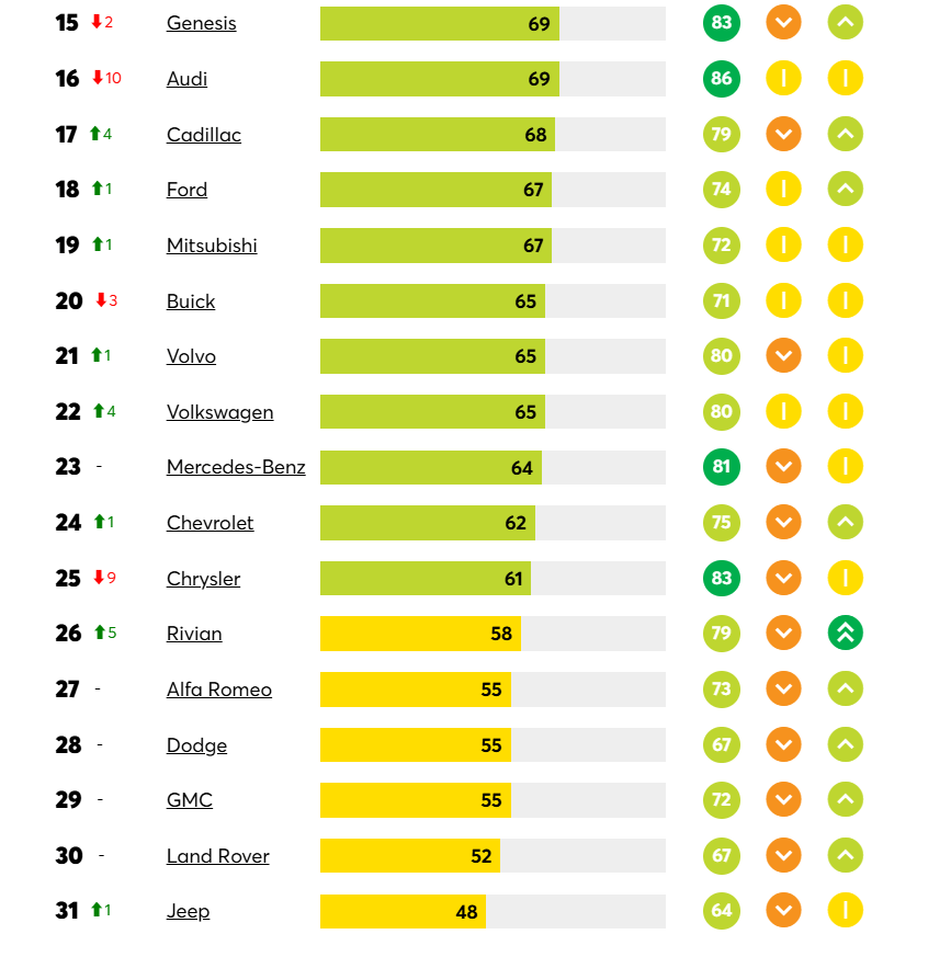 其余在榜單中的品牌得分均在60分以下,分別為Rivian、阿爾法·羅密歐、道奇、GMC、路虎和Jeep。這幾個品牌也是《消費者報告》榜單中,常年處于墊底位置的幾個品牌。其中,Rivian排名提升了5位,排在第26位。不過,Fisher表示,Rivian的車型是所有品牌中可靠性最低的。
