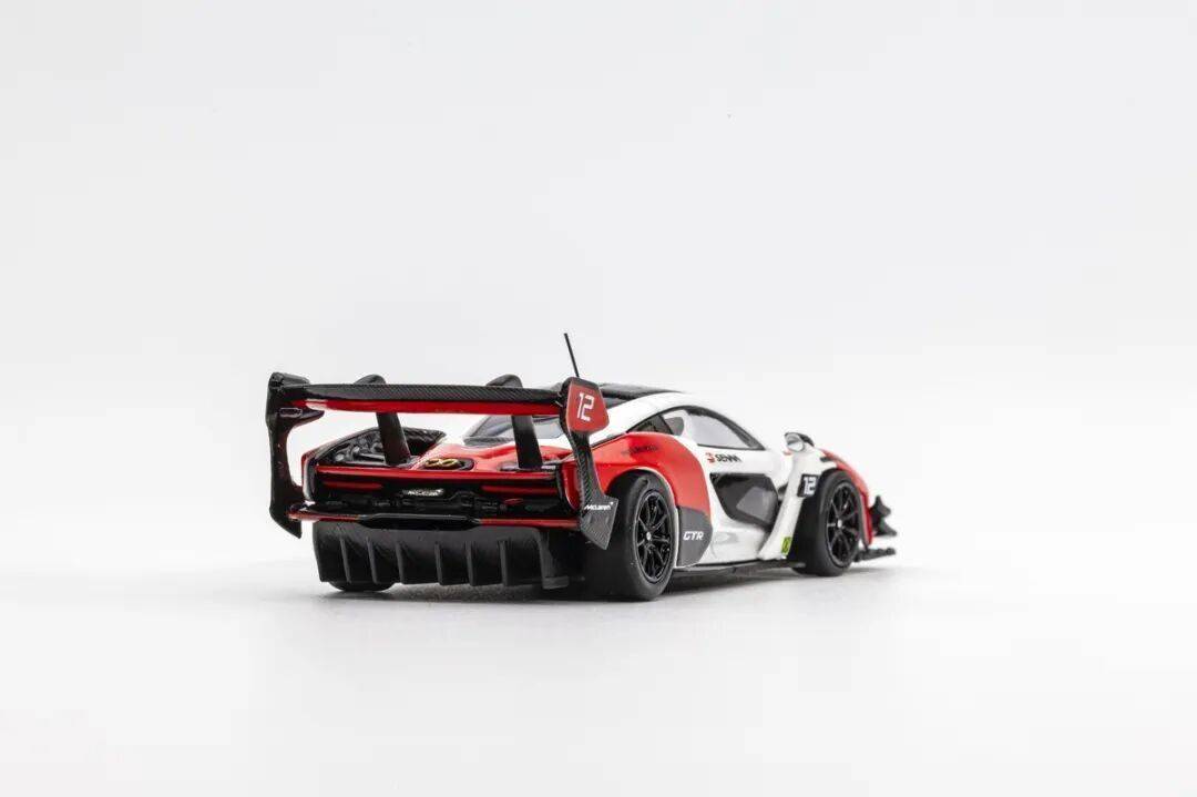 相對于1/64比例模型來說,LCD的這款Senna GTR內飾刻畫也算比較到位,特別是桶式座椅,采用了LCD特有的紡翻皮涂料,安全帶和儀表盤細節也是有所刻畫的,車頭的進氣口結構也是有做出來的,拆模型的時候掉了一邊;模型的發動機也有碳纖維貼紙細節。車頭的碳纖維是左右對撐的,雨刮器也是和擋風玻璃一體成型,然后再畫成黑色的。發動機艙兩邊有鏤空的導風口,而且這個位置都是碳纖維貼紙覆蓋的,尾翼下方有雙出的排氣,排氣管向上,估計能提供一些下壓力。模型的車頂有類似F1的進氣口,而且也是覆蓋了對撐碳纖維的,A柱一直延伸到發動機艙的碳纖維也是左右對撐的;車頂還有浮雕的蝴蝶門合頁結構,通過發動機艙上方的透明窗能夠看到一些發動機細節;排氣管為全黑色,質感一般。