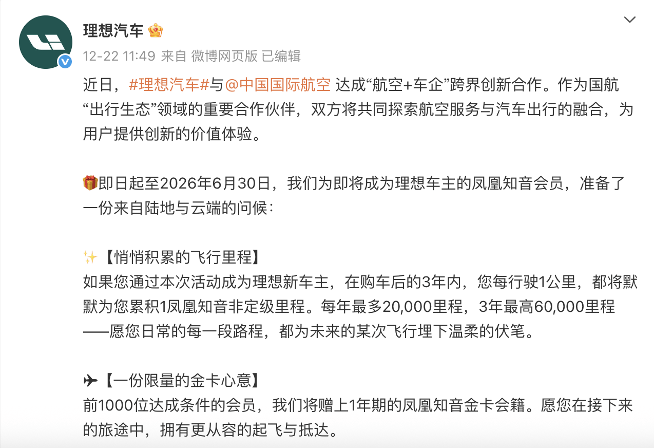 而最近幾天,理想汽車再次發文,稱與國航完成了“航空+車企”的跨界創新合作,接下來就是一些稱頌雙方合作價值的“廢話”,但是其中有關于能給到車主的權益和“福利”,可能讓很多還在猶豫要不要買理想汽車的小伙伴們心動了。首先就是通過這次活動購車后,那么自己的理想汽車在路面上行駛的里程,就能夠成為國航的鳳凰知音里程,每年20000里程,3年最高6萬里程,這個里程數是相當高的,用這些里程,可以在國航的在線商城兌換機票、兌換商品、升艙,也可以借此給自己的航司會員升級。