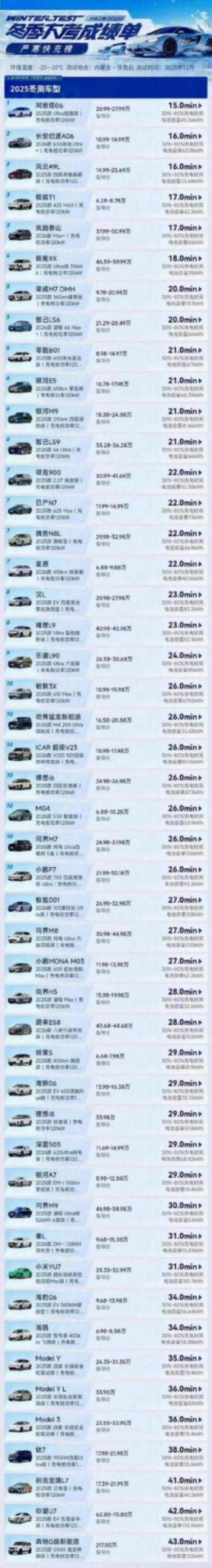 而在充電速度測試項目,是在120kW功率充電樁上,統計車輛從30%-80%的充電速度。從充電時間上來看,充電時間在20分鐘以內的有6款車型,其中,耗時最短的是阿維塔06,用時僅15分鐘;其次是長安啟源A06和風云A9L,充電時間均為16分鐘;極狐T1、嵐圖泰山充電用時為17分鐘;極氪9X用時為18分鐘;其余均超過了20分鐘。用時最長的是奔馳G級新能源,用時達到了43分鐘。