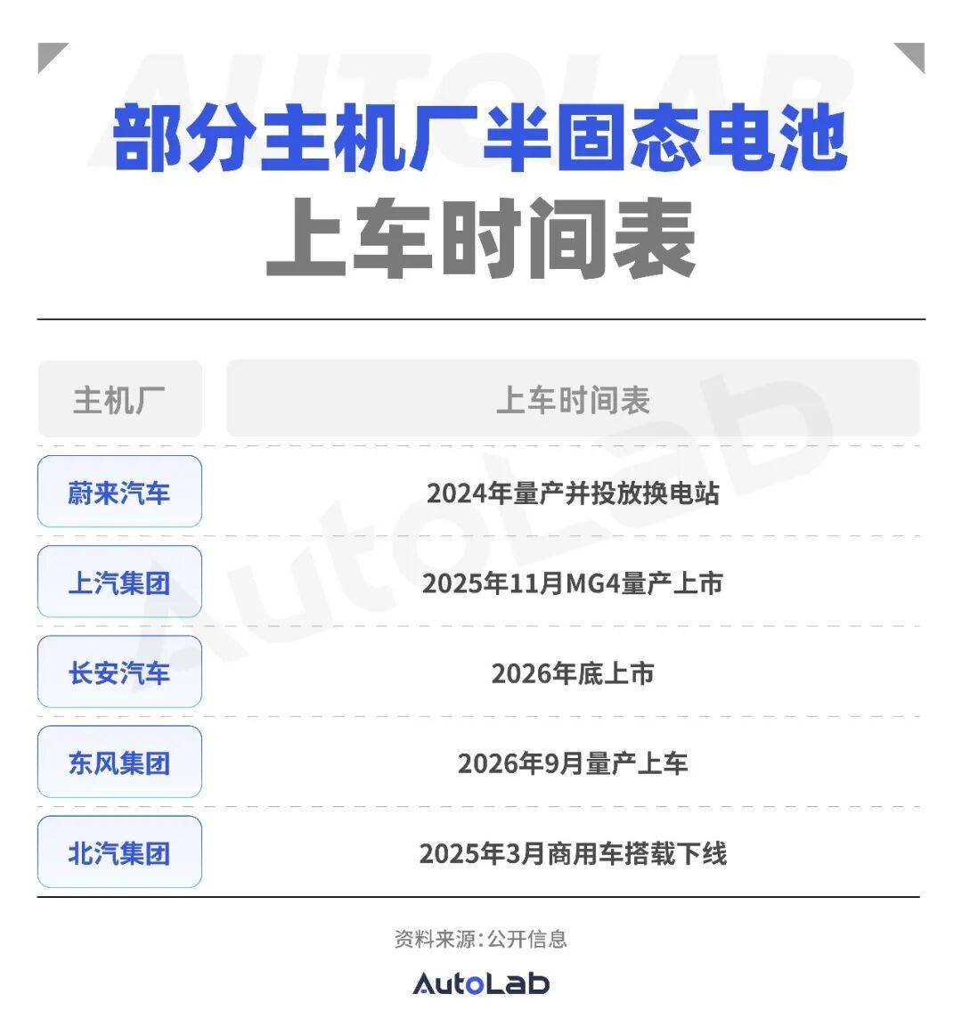 我們也為大家歸納了部分車企的半固態(tài)電池上車時間表: