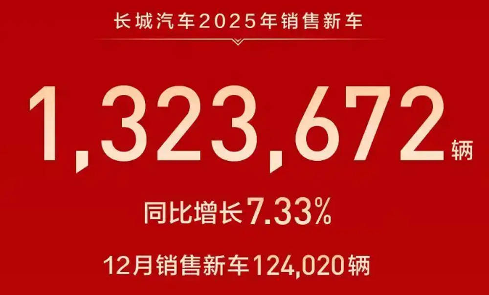 根據公開的銷售數據顯示,長城汽車2025年12月銷量為124020臺,環比同比都出現了一定程度的下滑。2025年1-12月累計銷量達到1323672臺,同比增長7.33%,其中,新能源汽車全年總銷量為403653臺,同比增長25.44%。牢牢守住年銷100萬輛俱樂部成員資格,也是不爭的事實。