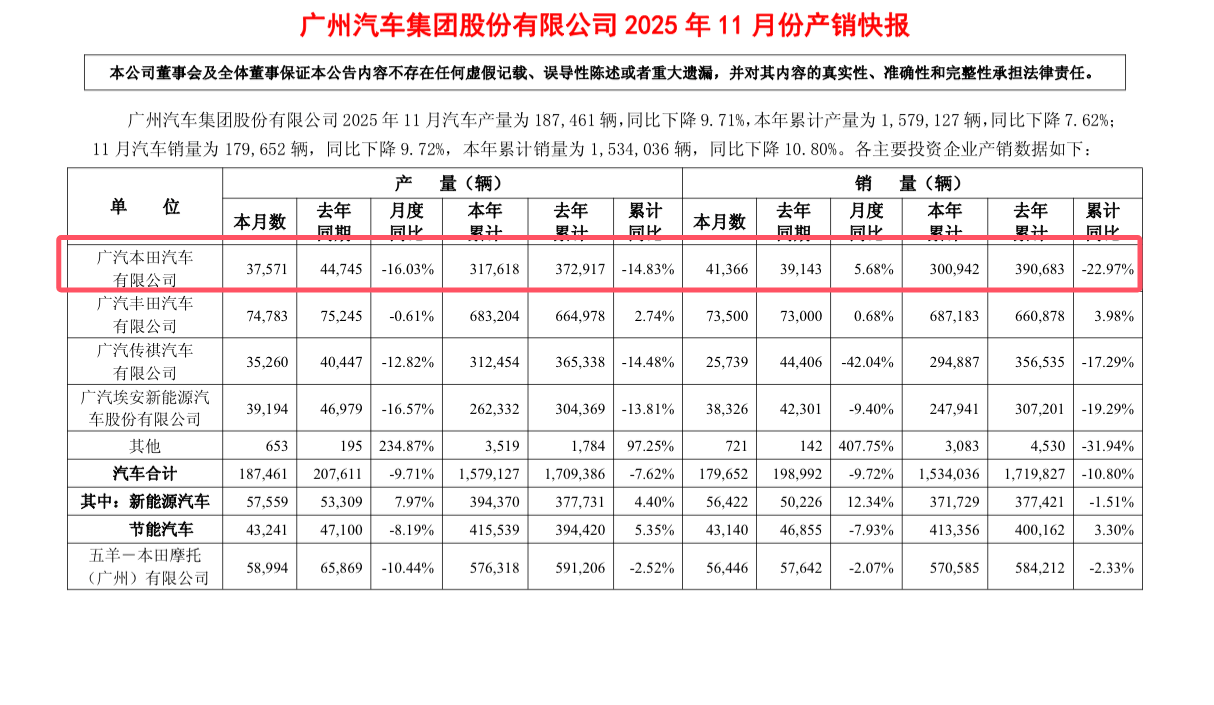 畢竟,從廣汽本田目前的市場表現來看,其在中國車市應該承受了一定的壓力或者挑戰。從廣汽集團發布的產銷快報來看,2025年1-11月份,廣汽本田銷量呈現出一定幅度的下滑態勢。