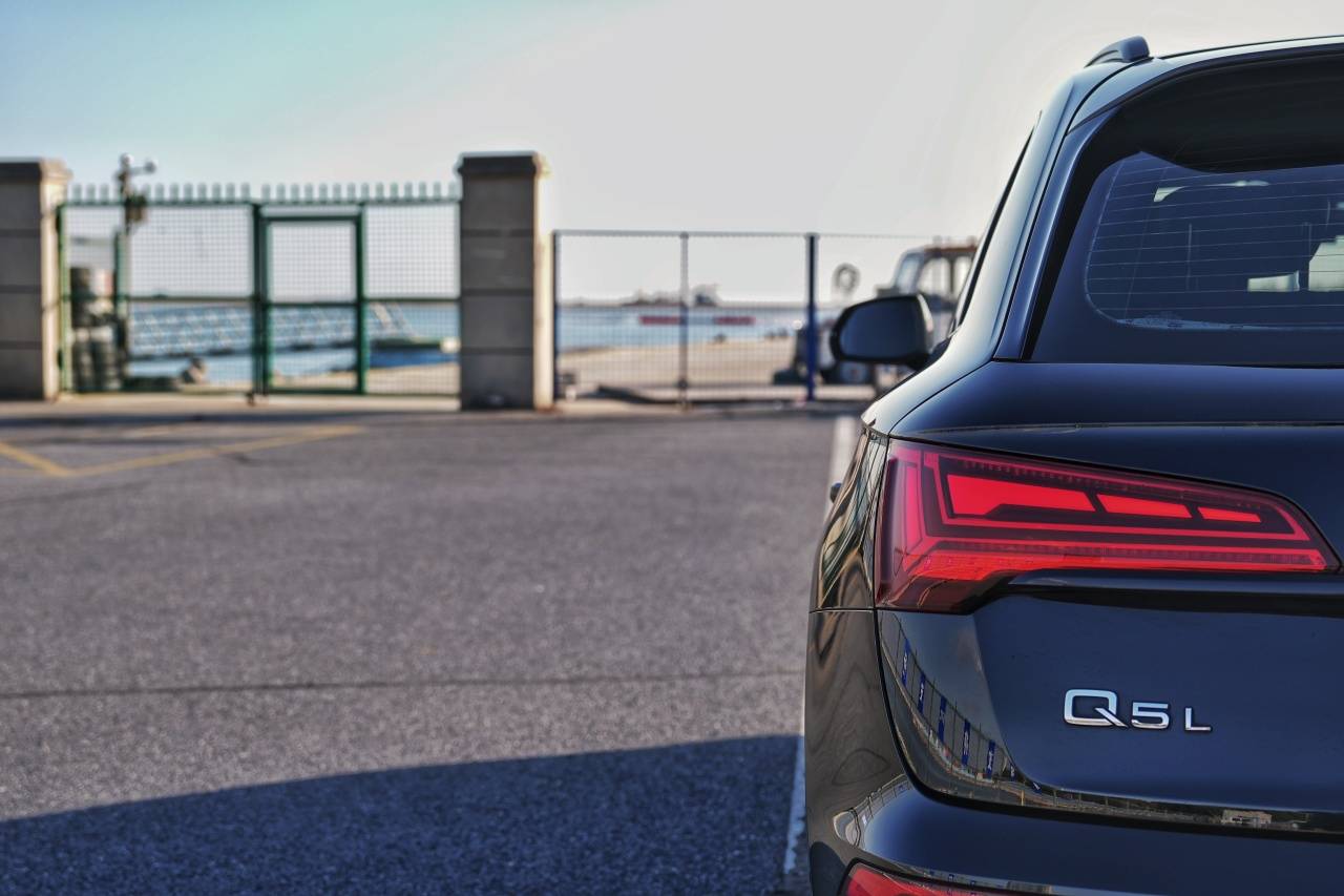 視線移至側面,那條平直銳利的腰線如刀鋒劃過車身,從日行燈眉角直直地延伸至尾燈,這是一個很好的設計點,不僅拉長了視覺感受,更賦予Q5L一種緊繃運動的張力。輪拱的弧度飽滿有力,可以容納更大尺寸的輪轂,盡管現在的輪轂造型我已經很滿意了。