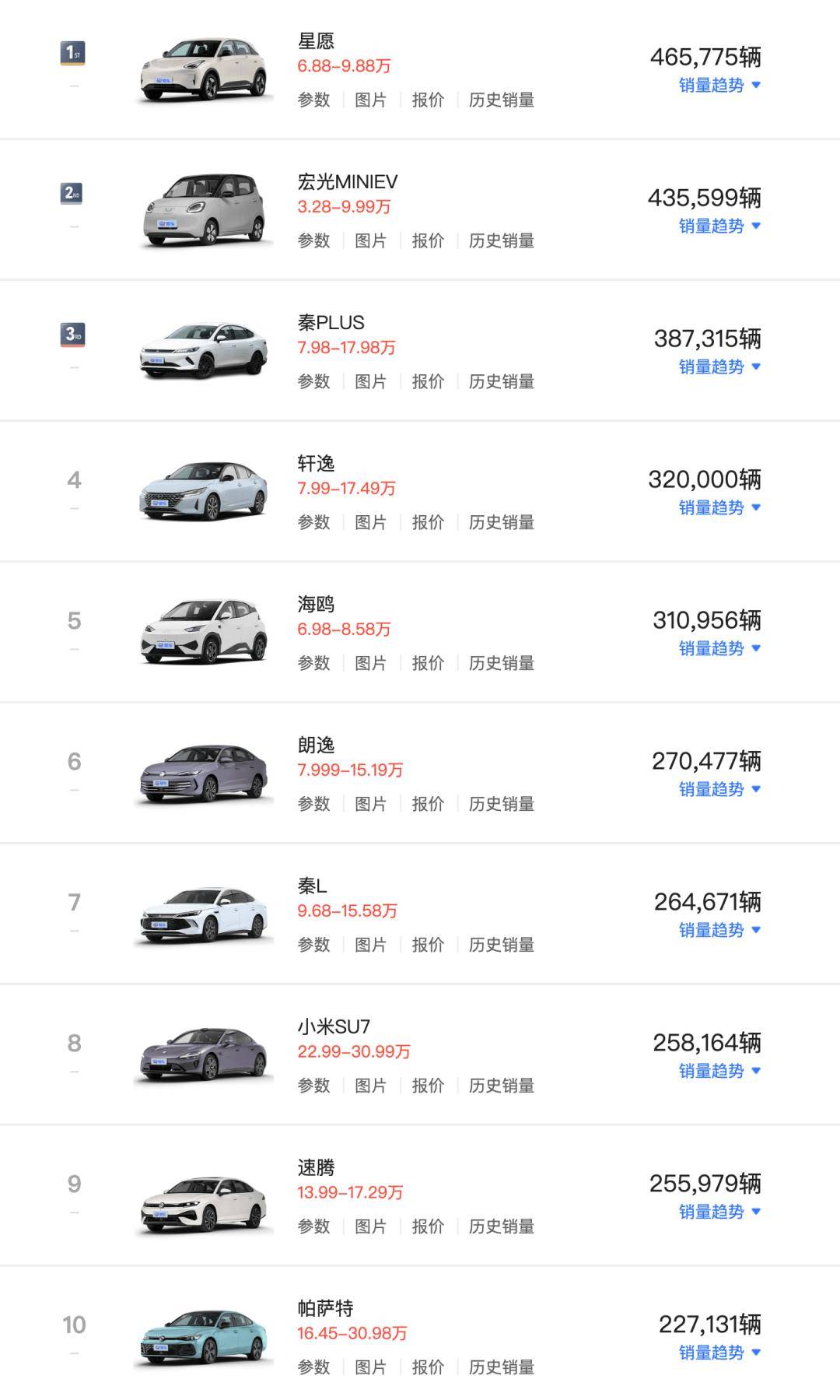 首先來看轎車銷量榜,吉利星愿全年銷量465,775輛穩居第一,以Flyme Auto智能座艙、401km續航與6.58萬起親民價,精準覆蓋年輕家用與代步剛需,成為2025年的車市黑馬。秦PLUS憑DM-i超混的低油耗與空間優勢穩居家用新能源前三,秦L以運動化設計拓展年輕市場,海鷗以高性價比鞏固A0級純電地位,三者形成“插混+純電”的全矩陣覆蓋。此外,小米SU7上市以來的首個完整年度,全年交付258,164輛,是唯一一款新勢力車型,憑借智能駕駛與科技配置吸引群體,成為2025年市場最大驚喜之一。
