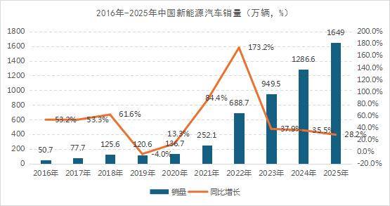我們先來看看2016年到2025年中國新能源汽車歷年銷量情況。