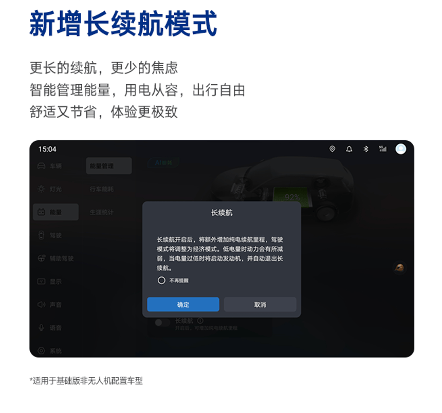 娛樂與交互層面,系統(tǒng)新增電子木魚小游戲、多屏同步登錄、音樂共享播放等功能,并上線多款裸眼3D動態(tài)主題。續(xù)航方面,新增“長續(xù)航模式”,通過優(yōu)化能量管理策略,在CLTC工況下純電續(xù)航最高可達230公里。此外,手車互聯(lián)、智慧物聯(lián)及語音控制系統(tǒng)亦有細節(jié)優(yōu)化。