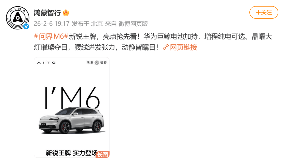 在工信部公示后,鴻蒙智行官方在社交媒體發(fā)文介紹了問界M6有關(guān)信息,可以看到問界M6增程版有37/53度電池可選,純電版則標(biāo)配100度電池。