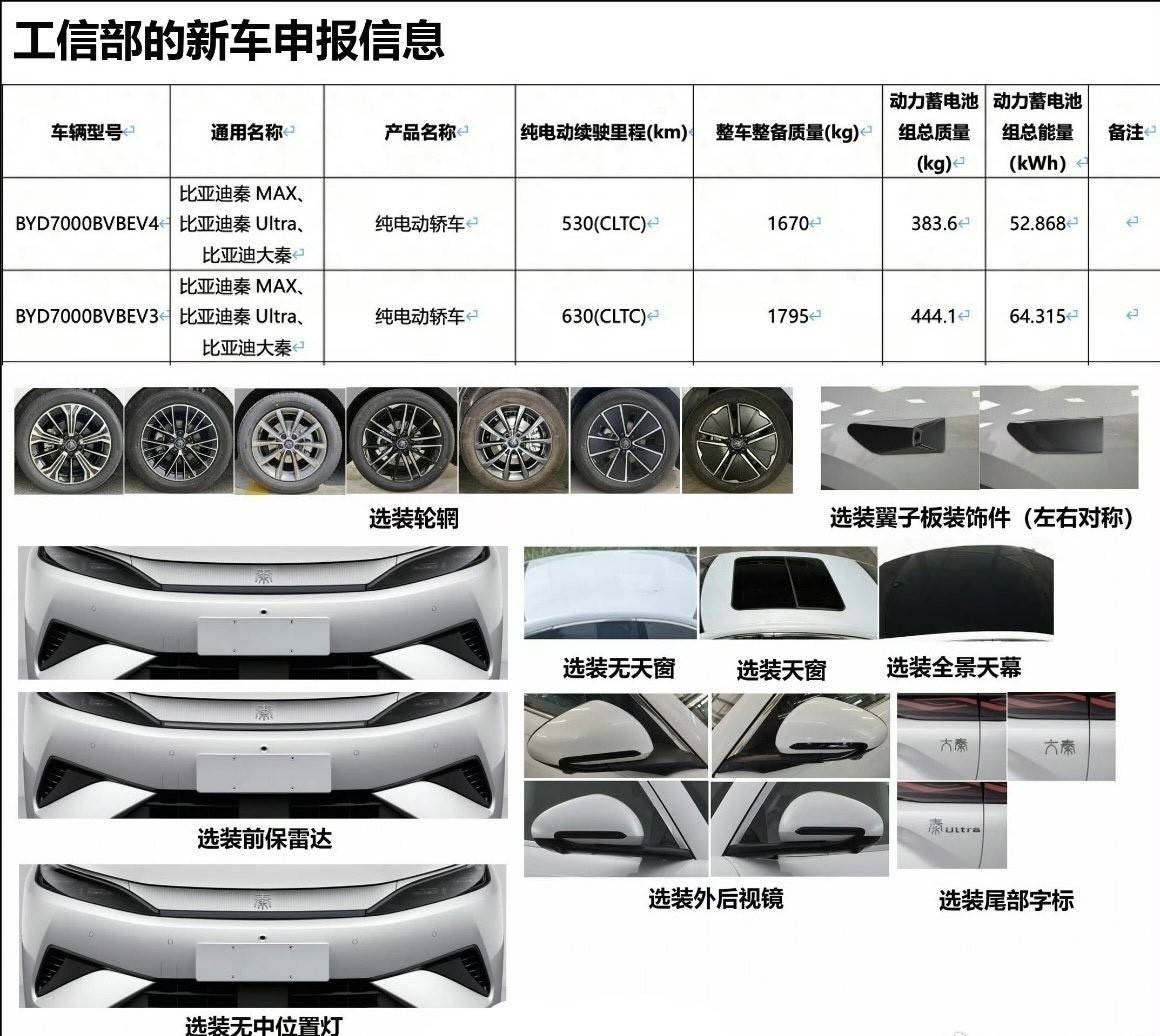 外形上,秦MAX和秦L的設計差不多,僅在保險杠、中網等細節部位微調,保險杠兩側的黑色格柵面積更大,風格更運動。車尾造字標可選“大秦”或“秦ultra”等。此外還提供輪圈、翼子板裝飾件、天窗/天幕等多種選配。