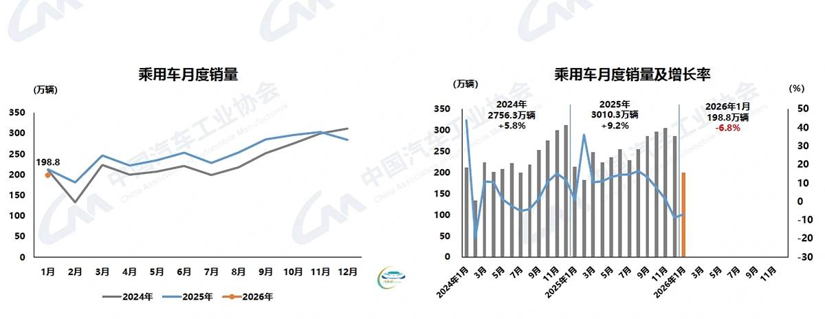 中汽協數據顯示:1月,汽車產銷分別完成245萬輛和234.6萬輛,產量同比增長0.01%,銷量同比下降3.2%,環比分別下降25.7%和28.3%。