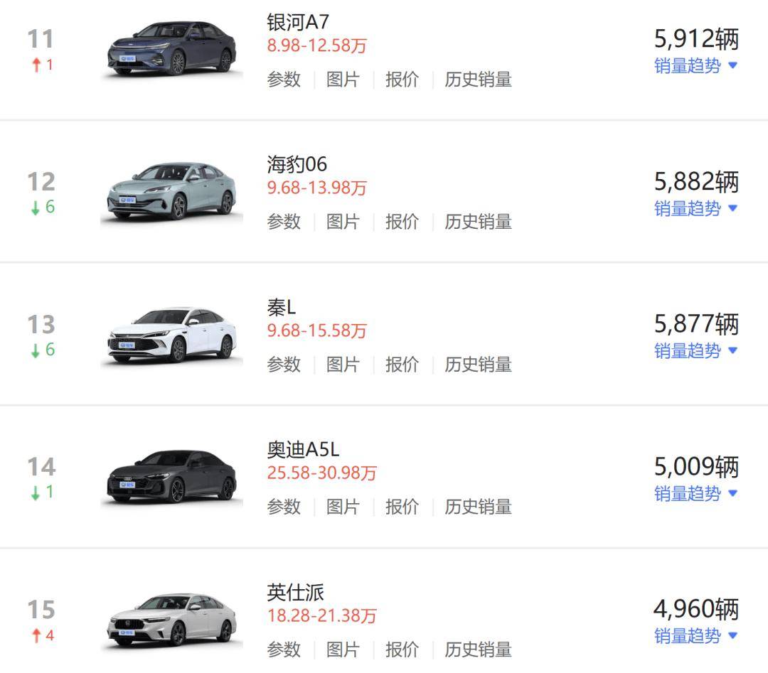 除此之外,銀河A7、海豹06、秦L、英仕派四款車型分別排名榜單第十一名、十二名、十三名、十五名,銷量分別為5912輛、5882輛、5877輛、4960輛。