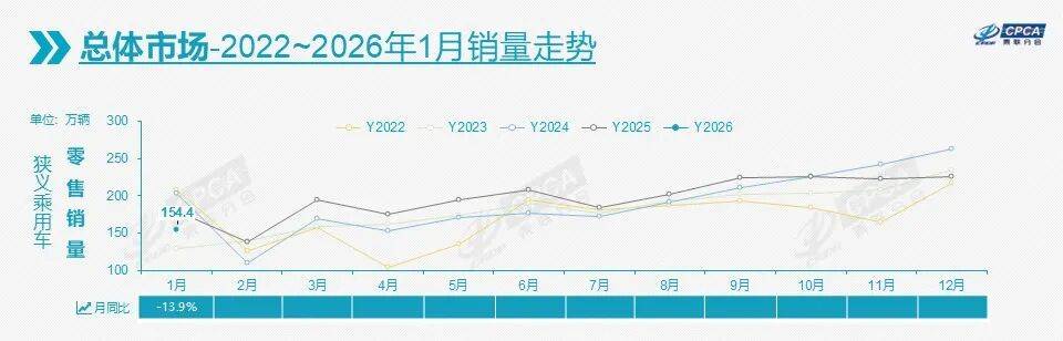 全國乘用車市場1月銷量數(shù)據(jù)出爐了。如各位感知,冷風瑟瑟,1月全國乘用車零售154.4萬輛,同比下降13.9%。
