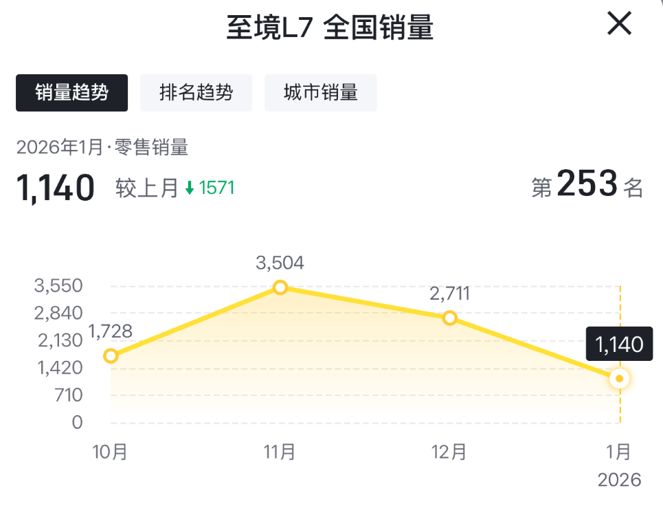 這意味著,從2025年12月份開始,截止到2026年1月份,至境L7的單月零售銷量已經(jīng)接連2個(gè)月下滑了。
