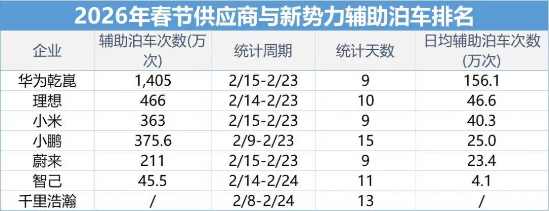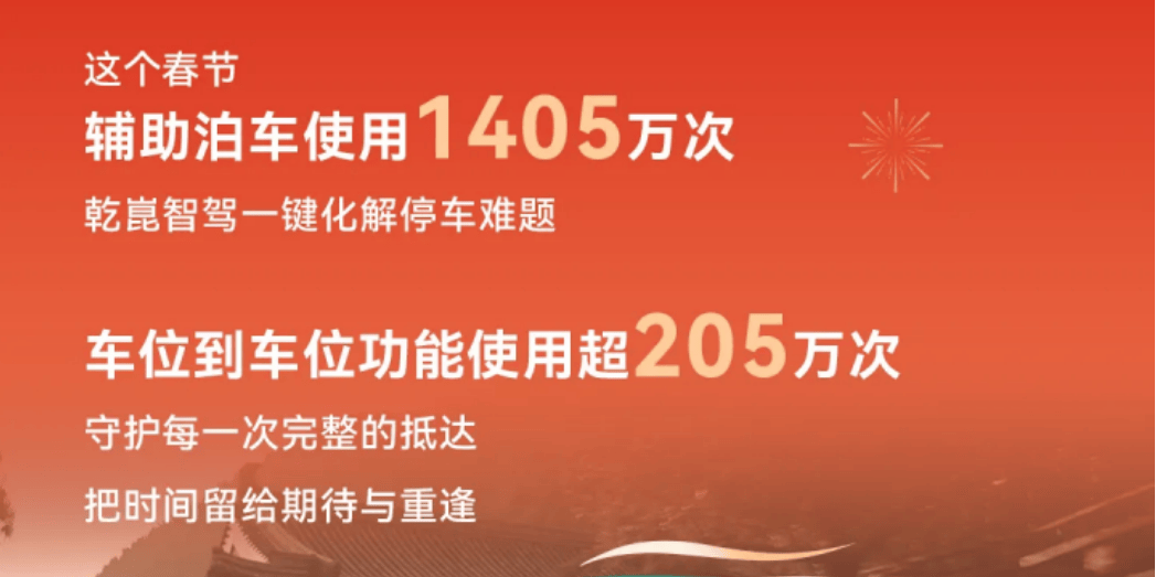 圖丨2026年春節,華為乾崑輔助泊車使用1,405萬次,車位到車位超205萬次