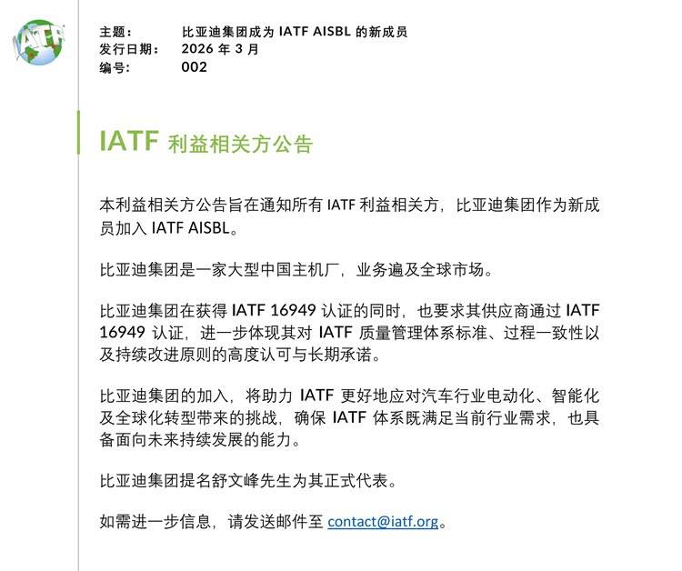 3月10日,比亞迪經(jīng)IATF全體成員投票通過(guò)正式入局,由美國(guó)汽車工業(yè)行動(dòng)集團(tuán)(AIAG)提名,委派專人參與核心標(biāo)準(zhǔn)制定。IATF作為全球汽車行業(yè)最權(quán)威的標(biāo)準(zhǔn)制定機(jī)構(gòu),1999年成立以來(lái)一直被大眾、通用、奔馳等歐美傳統(tǒng)車企壟斷,其IATF 16949標(biāo)準(zhǔn)是全球汽車供應(yīng)鏈的“準(zhǔn)入通行證”,比亞迪此次入局,直接打破歐美數(shù)十年標(biāo)準(zhǔn)壟斷,實(shí)現(xiàn)中國(guó)整車車企在該領(lǐng)域話語(yǔ)權(quán)零的突破。