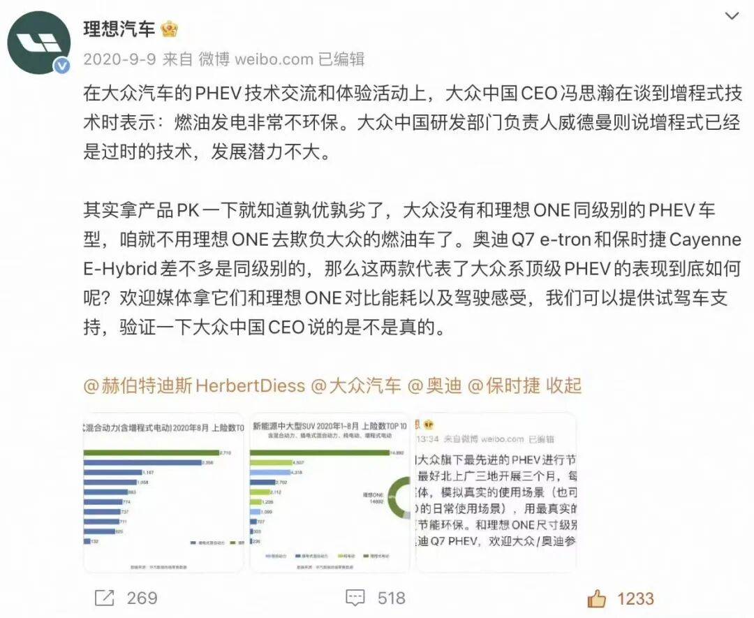 而在孫敏杰曬出的第二張微博配圖里, 理想汽車在2020年發布微博時稱大眾高管曾表示增程是過時的技術。