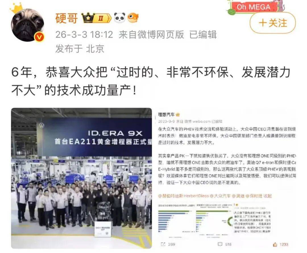 值得注意的是,上汽大眾此次布局增程領域的動作,還引發了與理想汽車的一場隔空對話。3月3日,理想汽車公關部社交媒體總監孫敏杰(新浪微博@硬哥)發文稱:“6年,恭喜大眾把‘過時的、非常不環保、發展潛力不大’的技術成功量產!”其中一張配圖是3月2日上汽大眾宣布“EA211黃金增程器”正式下線的消息。