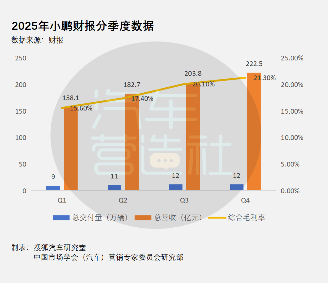 從財報數據看,小鵬全年交付量逐季穩步攀升,Q4 創下單季新高,全年同比增長 125.9%;營收連續四個季度環比增長,Q4 達 222.5 億元,同比增長 38.2%;毛利率也連續四個季度提升,從 Q1 的 15.6% 升至 Q4 的 21.3%,盈利效率也在持續改善。這意味著,小鵬2025年真正修復的,不只是某一個季度的表現,而是全年經營節奏。