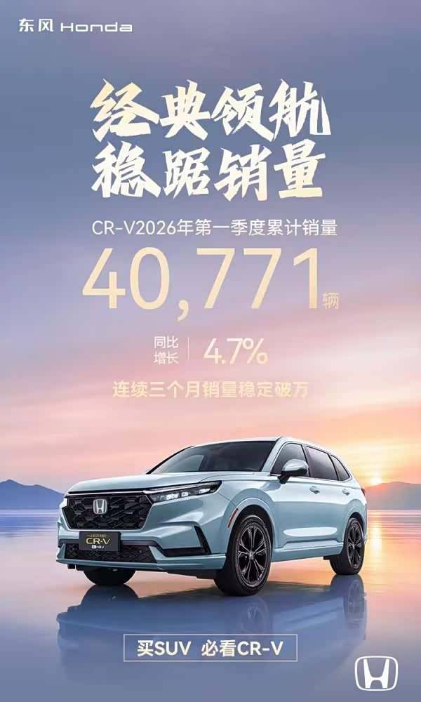 而作為品牌銷量的"壓艙石",CR-V在一季度售出40,771臺,同比增長4.7%,連續(xù)三個月單月銷量突破萬臺大關(guān)。在緊湊型SUV這個競爭最慘烈的細分市場,CR-V連續(xù)三個月月銷破萬,說明它的用戶基本盤依然穩(wěn)固。要知道,這個市場里不僅有大量自主品牌插混車型的圍攻,還有同價位合資競品的價格下探。