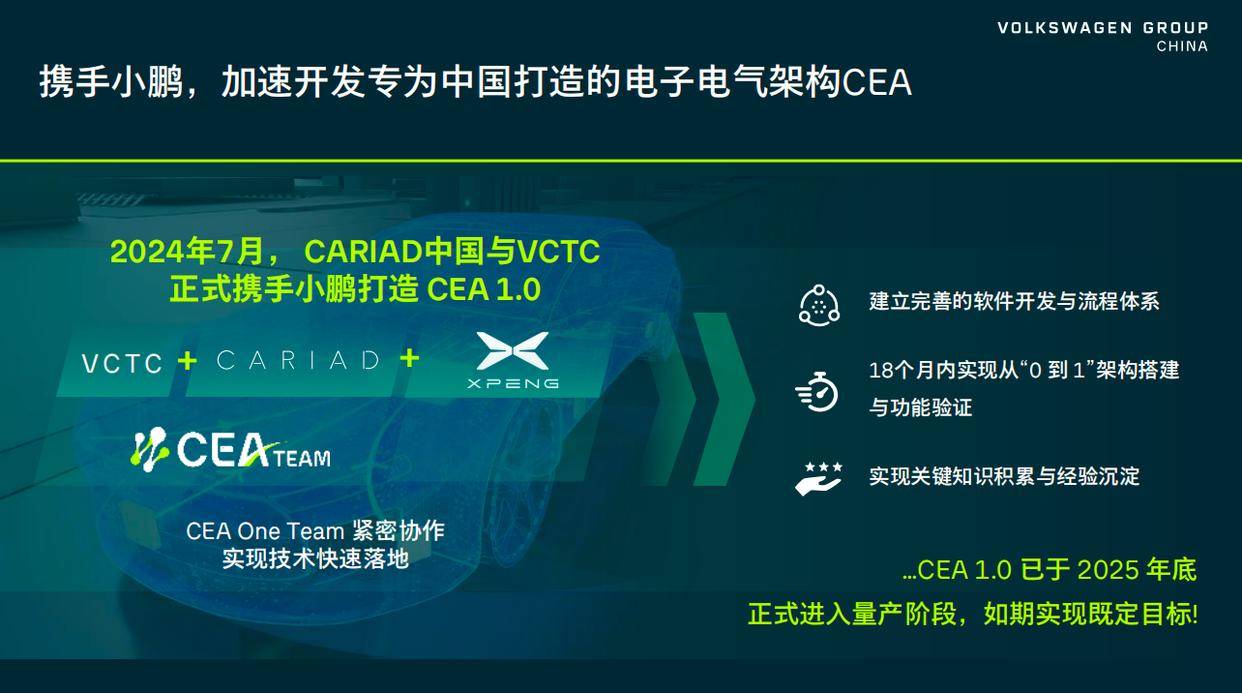 在核心技術層面,大眾以“軟件定義汽車”為中心,推出CEA電子電氣架構,實現對燃油、純電、插混、增程全車型的覆蓋。其中,CEA1.0版本聯合小鵬僅用18個月就完成研發并實現量產,標志著大眾在華本土軟件自主能力取得關鍵突破,為后續智能化功能落地奠定基礎。