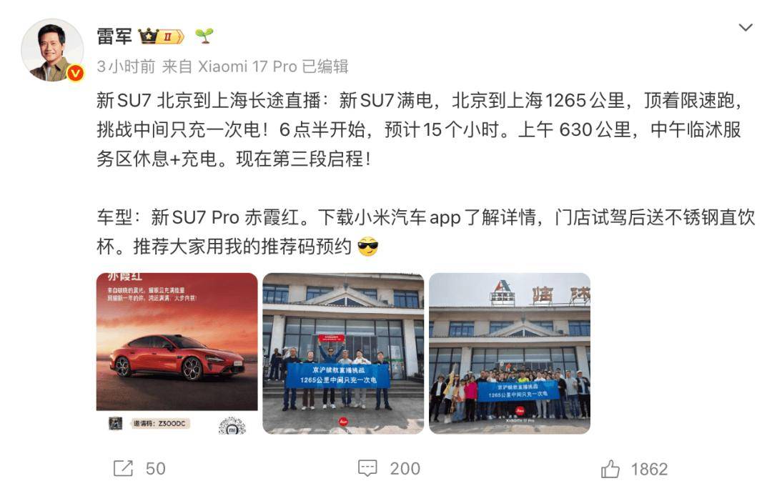 4月17日,小米創始人雷軍開啟小米汽車新一代SU7從北京到上海的長途續航測試直播。據了解,本次測試車型為新一代SU7 Pro赤霞紅車型,從北京到上海一共1265公里,從今天早上六點36分開始出發,預計歷時15個小時,雷軍本人全程參與并直播新一代小米SU7從北京到上海的長途續航測試,實時分享路況以及電耗等數據。