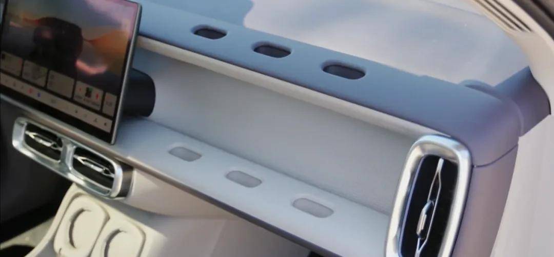 奇思妙想的小設計上,雖然沒有配備給副駕一塊娛樂屏,但為了照顧到副駕的乘坐體驗,在上方設計了六個魔術拓展塢,有點類似家里的洞洞板,可以讓自己去DIY,根據自己的喜好和需求去設計,比如說隨車贈送的的小折疊板,面積不大,和飛機上的小桌板差不多,用來放個電腦,臨時辦公還是很不錯的。