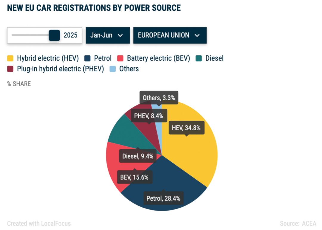 在歐洲,根據歐洲汽車工業協會(ACEA)數據,從2024年11月開始,HEV在市占率上實現了對汽油車的超越,成為歐洲汽車銷量最大的類別。今年上半年,HEV市占率更達到34.8%,如果再加上PHEV的份額(8.4%),“廣義混動”在歐洲市場的占比高達43.2%,相當于純電動車份額(15.6%)的2.7倍有余。