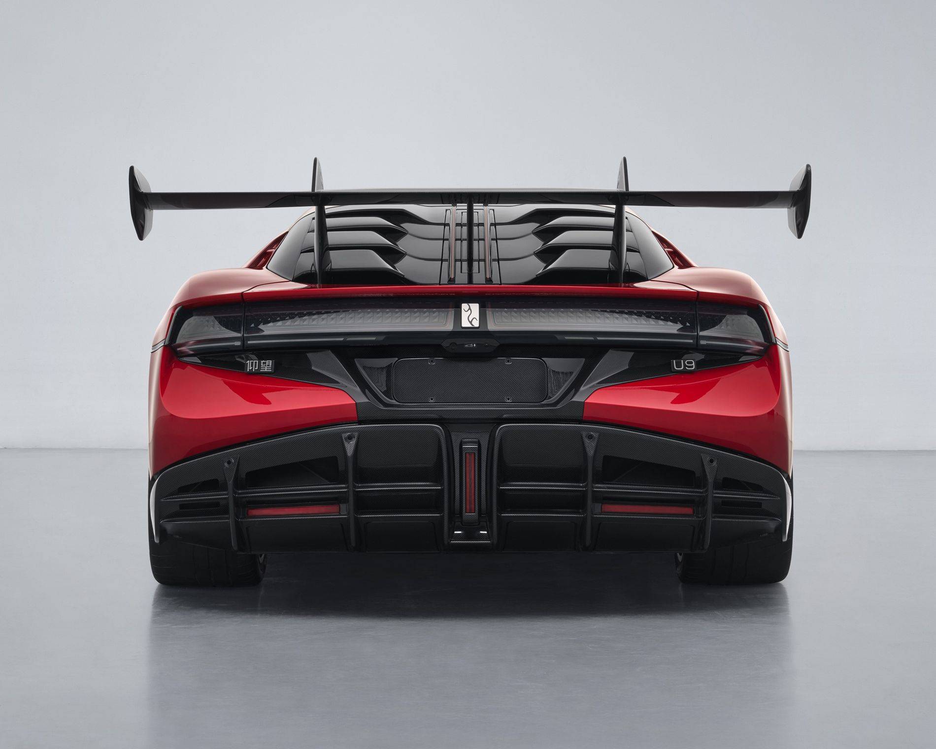 新款車型在外觀設計方面并沒有太多變化,申報車輛采用紅色涂裝,標配了碳纖維車頂和碳纖維固定式大尾翼,并且可以選裝增強型碳纖維大前鏟和碳纖維標準前鏟,電動尾翼也可作為選裝配置。U9賽道版采用325/35ZR20(112Y)的前后輪胎尺寸,相比在售版本在前胎尺寸上有所增加。