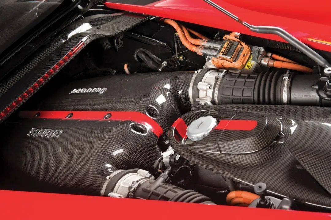 作為十年前混動超跑3劍客之一的拉法,HY-KERS混動技術也是當時的里程碑,其核心組件包括一臺V12自然吸氣發動機,6.3L排量,最大功率800馬力,峰值扭矩700N·m,轉速達9250rpm,創同排量引擎轉速紀錄。其電動機輔助為后軸搭載120kW電動機,綜合輸出功率963馬力,峰值扭矩900N·m,0-100km/h加速僅需2.4秒,極速超350km/h。拉法配置了Brembo定制剎車盤,配合輕量化制動鉗,100-0km/h制動距離僅29.5米。