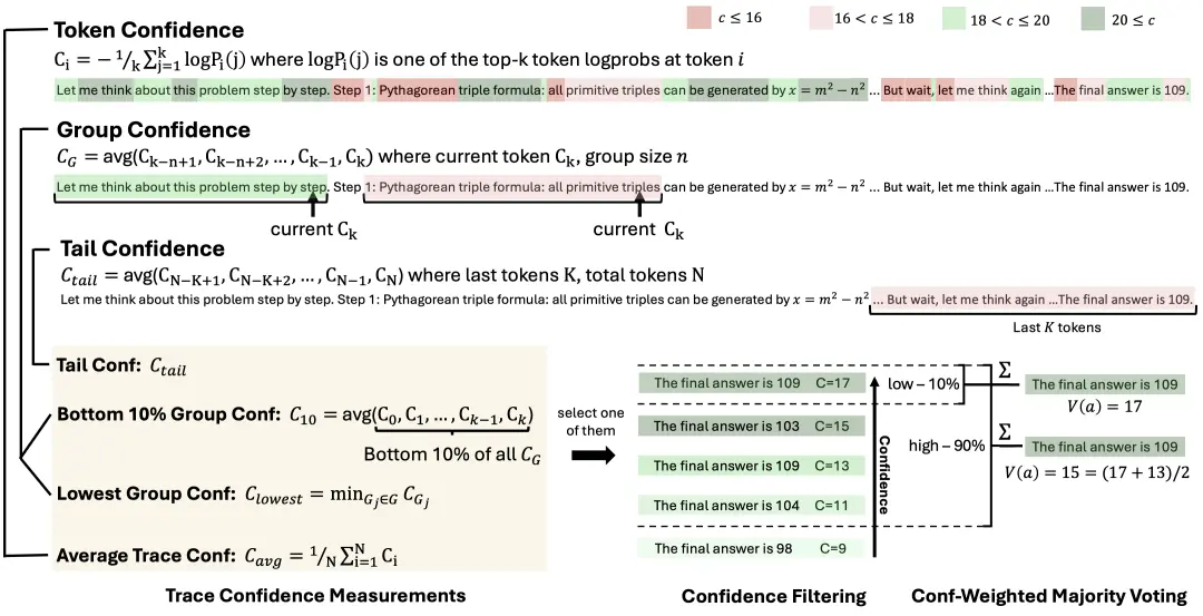 核心思想是DeepConf通過「置信度信號」篩選推理路徑,從而得到高質量答案,并在效率與準確率之間取得平衡。
