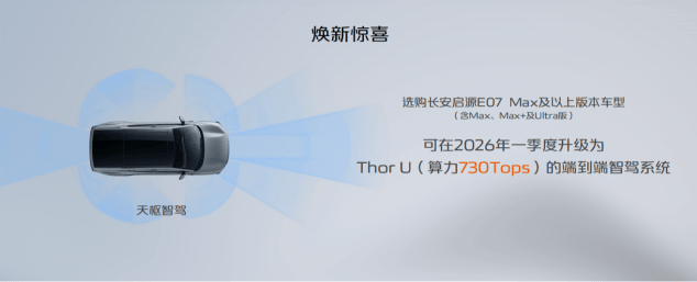 值得一提的是,品牌方還為消費者帶來“煥新驚喜”?;陂L安汽車全棧自研的SDA天樞架構所具備的“硬件可插拔”能力,長安啟源E07 Max及以上版本車型(含Max、Max+及Ultra版),預計將在2026年一季度升級搭載高算力Thor U(算力730Tops)的端到端智駕輔助系統,讓用戶暢享更智能、更安全的城區智駕體驗。